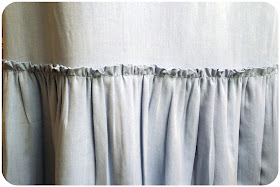 For the ruffle, I folded the top edge over 3/4" inch to created a clean finish. I gathered (lots of gathering) and attached the ruffle to the skirt by sewing it on top of the skirt. And I pressed my gathers down. It's finished with a 5/8" hem.